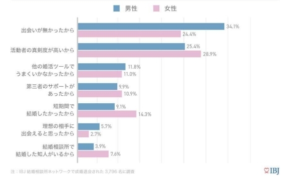 IBJの成婚者に実施した調査では、結婚相談所に入会した理由として「活動者の真剣度が高かったから」という回答が、男性25.4%、女性28.9%と高い割合となった。また、「第三者のサポートがあったから」も1割程度回答が集まっており、異性との交際経験がない若者が3割程度いることからも、若者を中心に”お付き合いの仕方がわからない”という方のサポートニーズが高まっている。